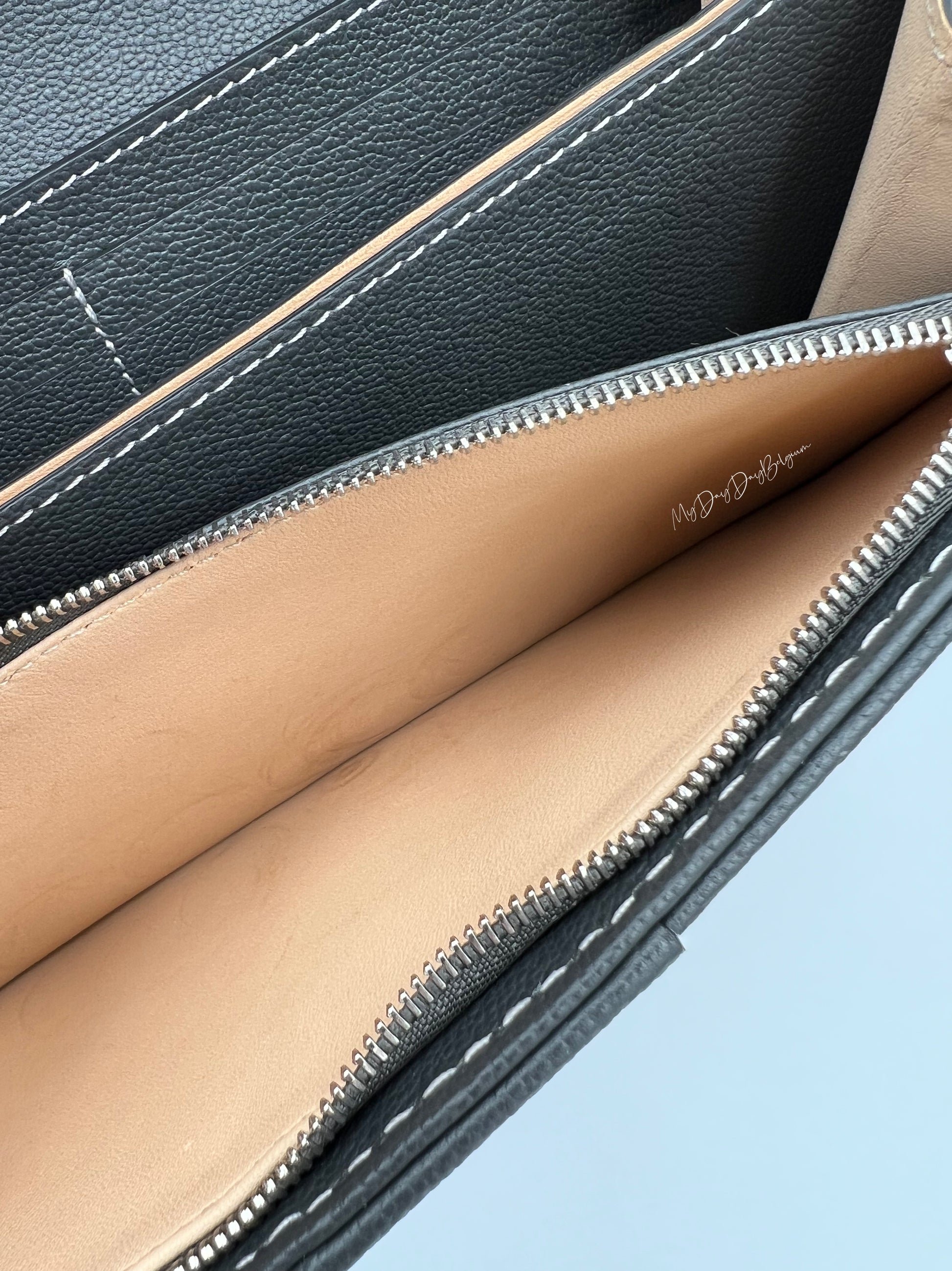 The Delvaux Brillant 2023 Wallet on Chain bag is where Delvaux's heritage meets modern functionality. The small structured shape, iconic buckle coupled with its elegant chain strap, makes it an easy day to day companion at every occasion. It carries perfectly as a crossbody chain bag, as it accompanies you turned into an evening pochette. The additional handstitched precision of the surpiqué in an ivory coloured thread adds an element of class to this quiet luxury bag. Particularly difficult in stitching process on such a high colour contrast stone rodeo calf leather, the stitches accentuate the bag's structural lines, but make any deviation in stitching highly visible when using such a thick threat. This wallet on chain is the work of a true artisan and master of his craft, but as it is done with apparent simplicity hiding the difficulty of the task - it further accentuate the timeless class and quiet luxury of Delvaux.